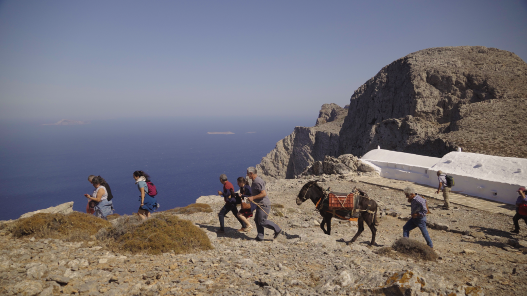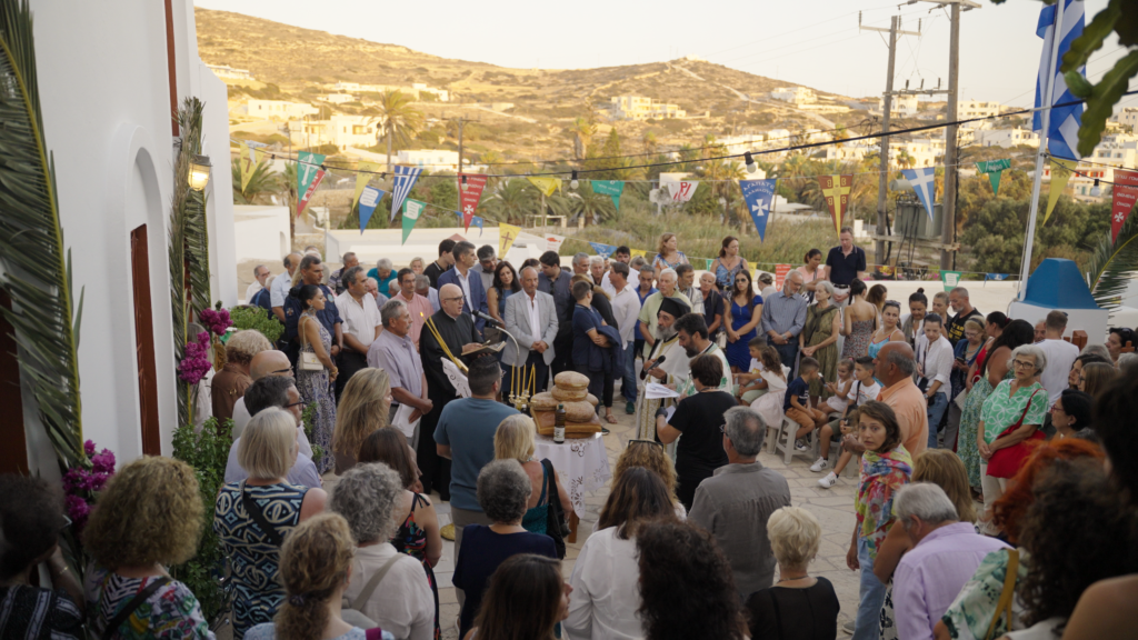 Πώς είναι να ζεις το ίδιο πανηγύρι σε δύο διαφορετικά νησιά των Κυκλάδων; Το ντοκιμαντέρ ξεκινάει από την Αμοργό με τους συντελεστές να ανεβαίνουν μαζί με τον Χρήστο και τον Γιάννη στον Σταυρό, ένα εκκλησάκι που «κρέμεται» σε έναν γκρεμό επάνω στον Κρούκελο, στα 700 μέτρα. Η διαδρομή ξεκινάει από την Λαγκάδα, μια διαδρομή δύσκολη που πηγαίνουν μόνο μουλάρια και κατσίκια. Άνθρωποι «σκληροί» ανεβαίνουν σε αυτό το πανηγύρι μόνο για να προσκυνήσουν, να πάρουν μια ανάσα τρώγοντας το φαγητό που τους ετοίμασαν από τα ξημερώματα τα παιδιά και να φύγουν πάλι κάτω.