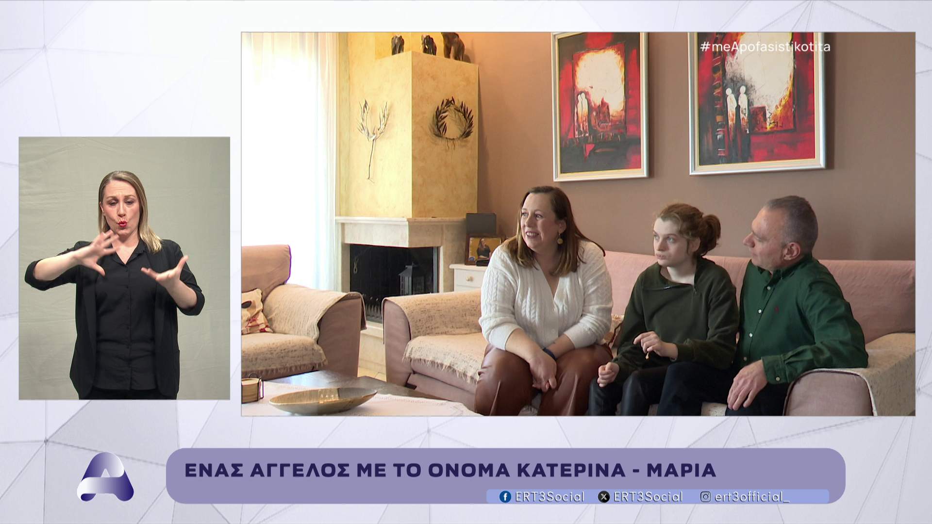 Η εβδομαδιαία ημίωρη εκπομπή της ΕΡΤ3 «Με Αποφασιστικότητα», με την Αναστασία Αργυριάδου την Τετάρτη 15 Απριλίου, στις 19:30, εστιάζει στο σύνδρομο Angelman και στην ξεχωριστή ιστορία της 18χρονης Κατερίνας-Μαρίας, παραδίδοντας ένα φωτεινό και βαθιά συγκινητικό μάθημα ζωής.