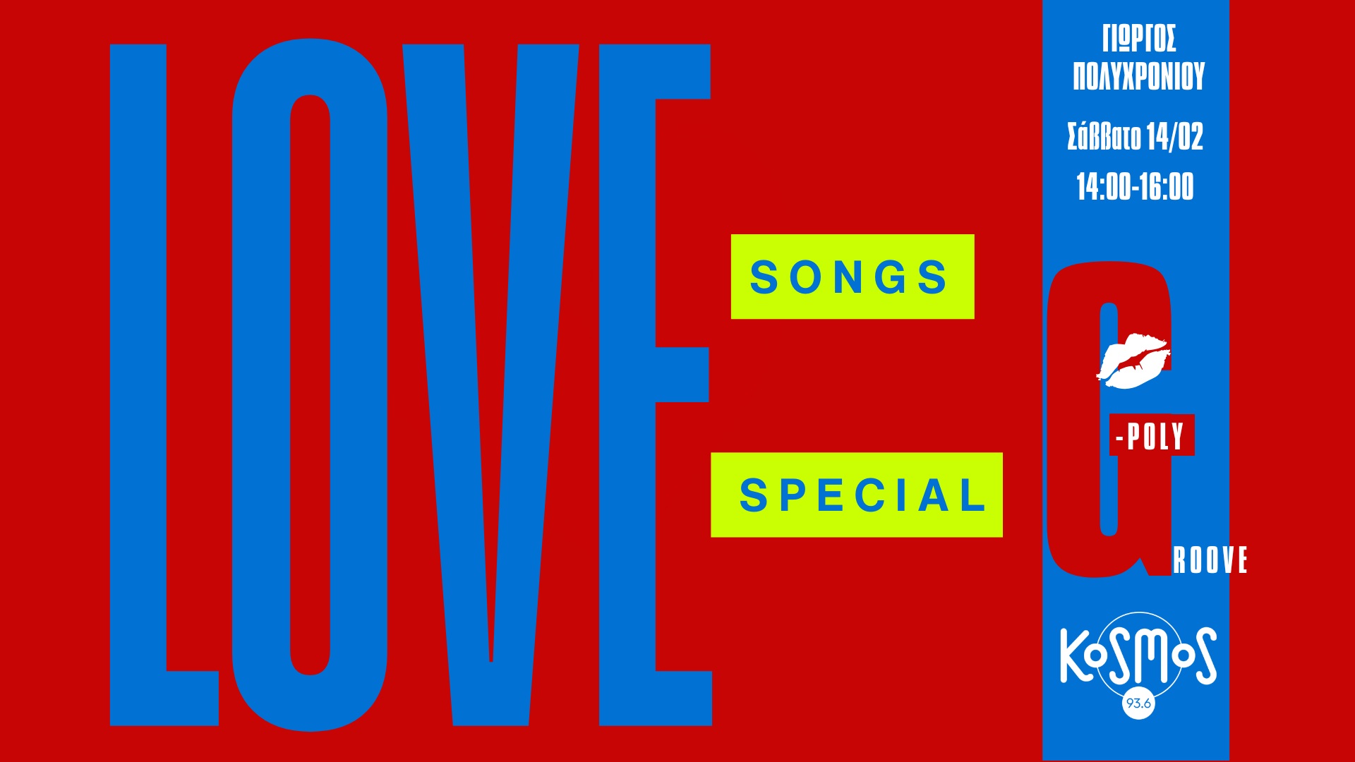 Το Σάββατο 14 Φεβρουαρίου 2026, Ημέρα των Ερωτευμένων, ο Γιώργος “GPoly” Πολυχρονίου σάς προσκαλεί στο Kosmos 93.6, στις 14:00, να την απολαύσετε ραδιοφωνικά.