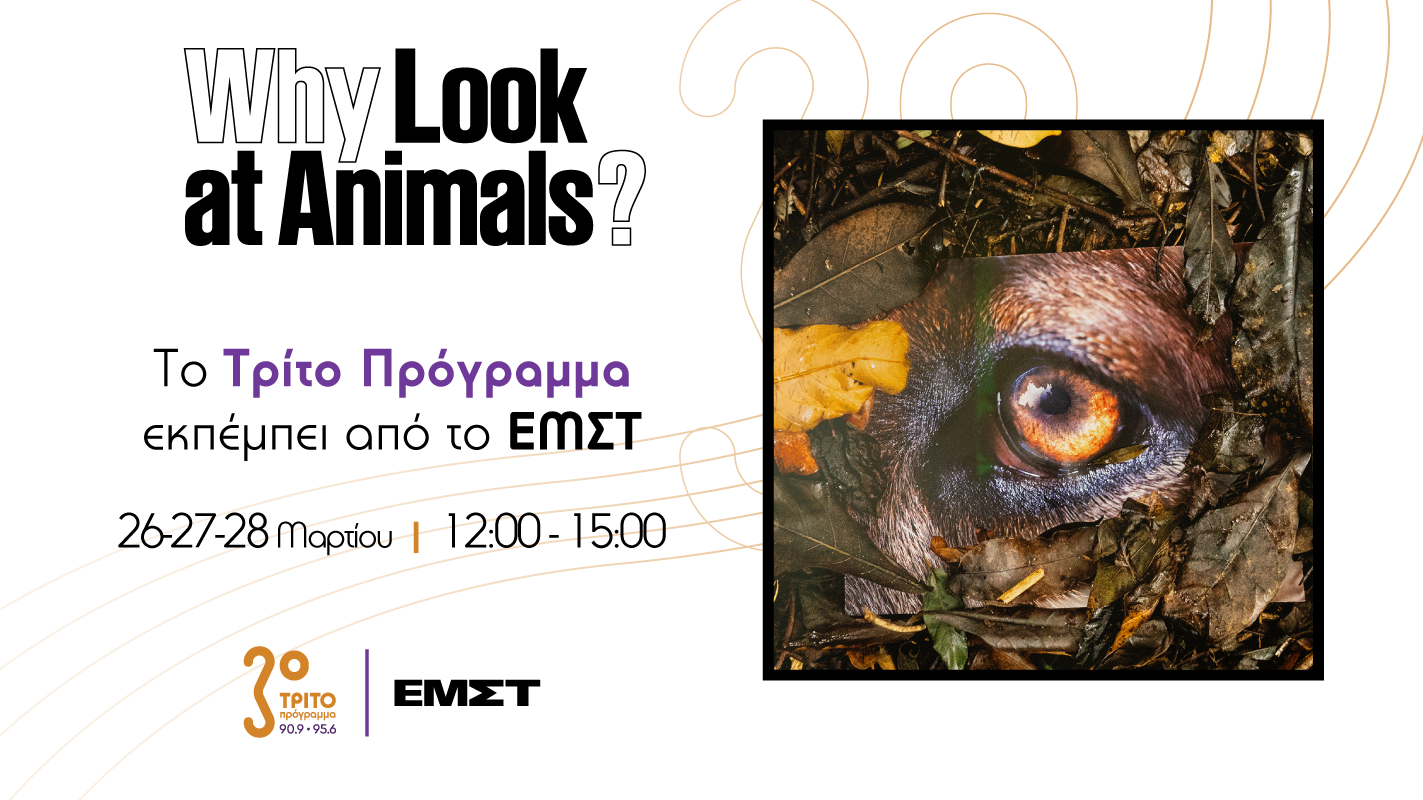 Από την Πέμπτη 26 έως και το Σάββατο 28 Μαρτίου 2026, 12:00 με 15:00, το Τρίτο Πρόγραμμα μεταφέρει το στούντιό του στο φουαγιέ του Εθνικού Μουσείου Σύγχρονης Τέχνης (ΕΜΣΤ), συμμετέχοντας ενεργά στον δημόσιο διάλογο που ανοίγει η έκθεση-παρέμβαση με τίτλο «Why look at animals? – Δικαιοσύνη για τη μη ανθρώπινη ζωή».